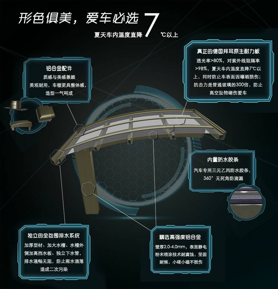 表面采用特别的流线设计,降噪音不溅雨,同时防止树叶、鸟粪及高空落物伤及爱车